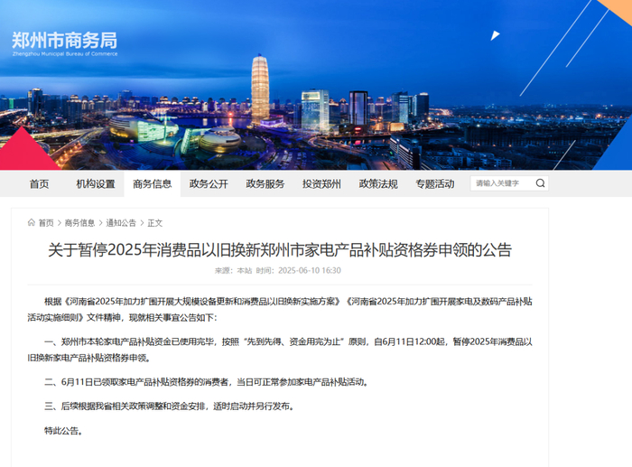 6月10日,郑州市商务局发布关于暂停2025年消费品以旧换新郑州市家电产品补贴资格券申领的公告》。