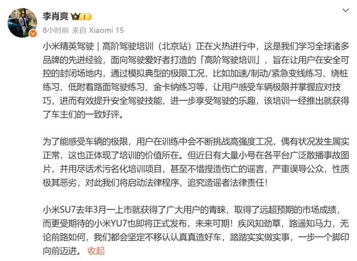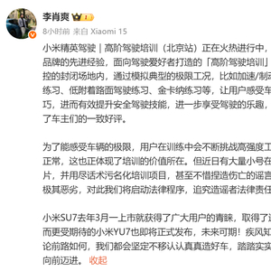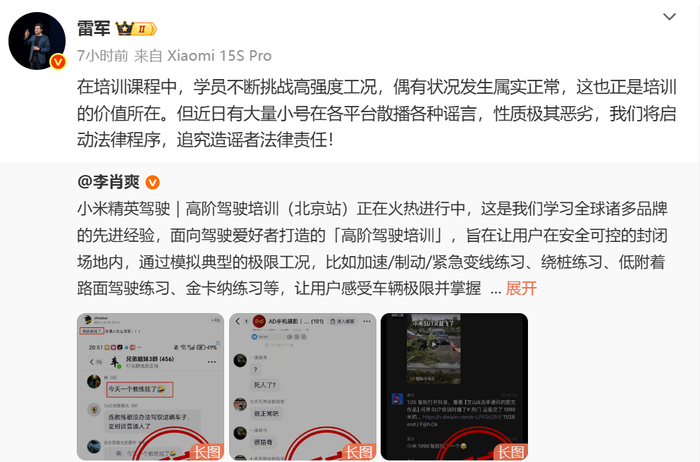 随后,小米汽车董事长兼CEO雷军也转发称:“在培训课程中,学员不断挑战高强度工况,偶有状况发生属实正常,这也正是培训的价值所在。但近日有大量小号在各平台散播各种谣言,性质极其恶劣,我们将启动法律程序,追究造谣者法律责任!”