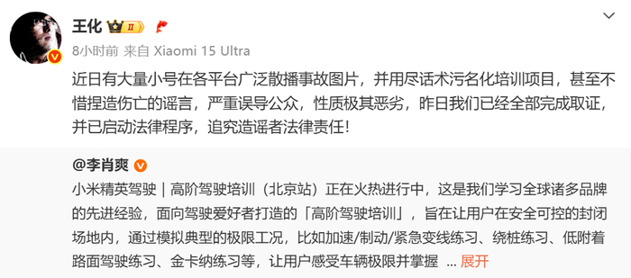 同日,小米集团公关部总经理王化也发文称:“近日有大量小号在各平台广泛散播事故图片,并用尽话术污名化培训项目,甚至不惜捏造伤亡的谣言,严重误导公众,性质极其恶劣,昨日我们已经全部完成取证,并已启动法律程序,追究造谣者法律责任!”