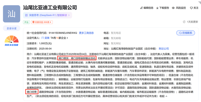 近日,比亚迪投资成立汕尾比亚迪工业有限公司,注册资本1000万元,由比亚迪汽车工业有限公司全资控股,经营范围涉及港口理货;港口货物装卸搬运活动;从事国际集装箱船、普通货船运输;港口经营;水路普通货物运输等一系列港航相关业务。