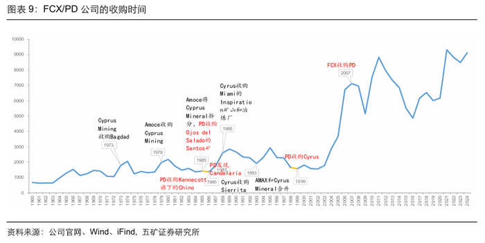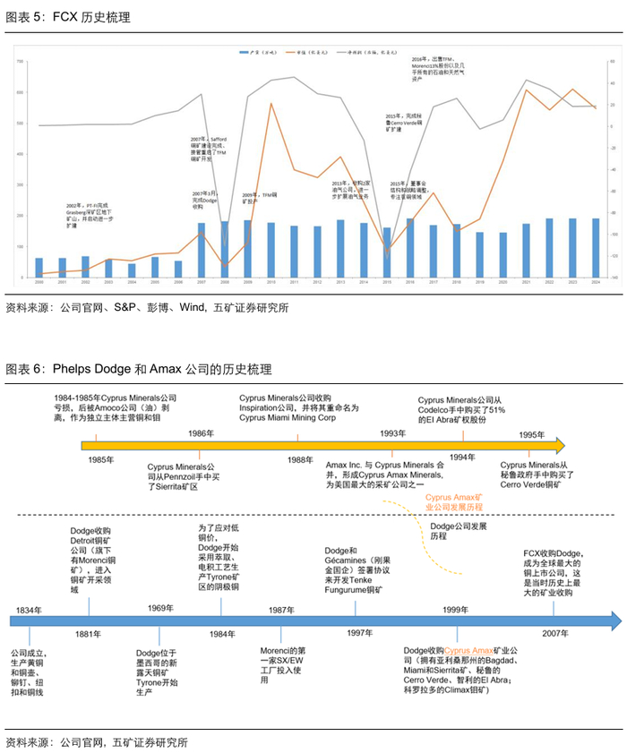 复盘FCX的历史可以发现,龙头的资产组合是由多家公司并购而来,包括Freeport Minerals(前身为Freeport Sulphur)、Phelps Dodge(2007年被FCX并购)、Cyprus Minerals(1999年被Dodge收购)、AMAX(1993年与Cyprus Minerals合并)和Climax Molybdenum(1957年与The American Metal Company合并,成为AMAX公司)等。