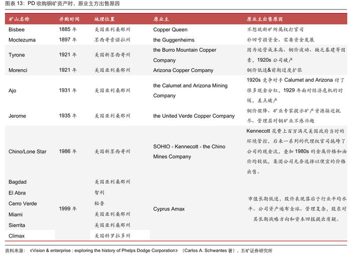 起家于亚利桑那州:1885年,Phelps Dodge收购了亚利桑那州的Bisbee铜矿,开启了矿山开采和资源探索的新业务版图。1897年收购与Bisbee同处一州的Detroit铜矿,1921年从竞争对手手里收购邻近的Arizona铜矿,合并改名为Morenci分支。1931年,PD收购Calumet and Arizona Mining Company,通过获取毗邻已有资源的Ajo矿区,PD得以整合Bisbee周边资源,低成本获得新矿山资源。1982年,PD从竞争对手公司收购了Banner矿区的主要矿体,整合了亚利桑那州的矿山资源,形成区域协同效应。