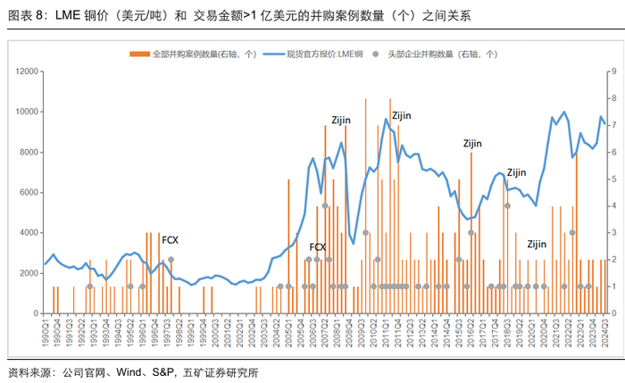 逆周期其实是并购行业的beta因素。我们梳理了1986年之后铜矿企业大型并购,发现并购投资规模呈波浪发展,呈现一定周期性。根据S&P,1986年至今铜行业共发生269起大型并购案例(交易金额>1亿美元),其中头部铜矿企业(BHP、FCX、Southern copper、Glencore、Zijin、Antofagasta、FQM、Anglo American、Rio、KAZ、Teck、Newmont、CMOC 等)并购 63 起。从并购时间点来看,大部分头部矿企的并购呈现逆周期性,其中紫金矿业的逆周期并购较为突出。从理论上来看,铜价进入下行周期后,一些企业或出现亏损/资不抵债等财务状况,从而寻求收并购;对于买方而言,逆周期并购的“性价比”较高。