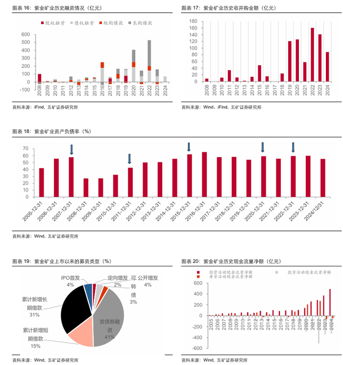 2023年拟发行可转债用于置换并购对价(并购山东海域金矿、苏里南Rosebel金矿、沙坪沟钼矿),拟募资不超过100亿元,但至今为止仍未发行。后2024年6月,公司发行“20亿美元年利率1%可转换公司债券”,用于偿还公司及子公司的境外债务;并且配售39亿港元新H股配售,约占本次配售完成后公司全部已发行H股股本总额的4.21%,募资约38.71亿港元,将用于海外市场的业务营运及发展(其中包括并购、营运资金及一般企业用途)。