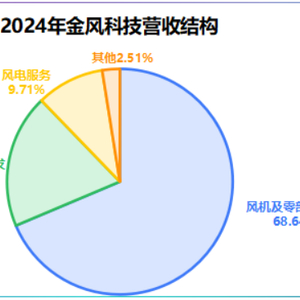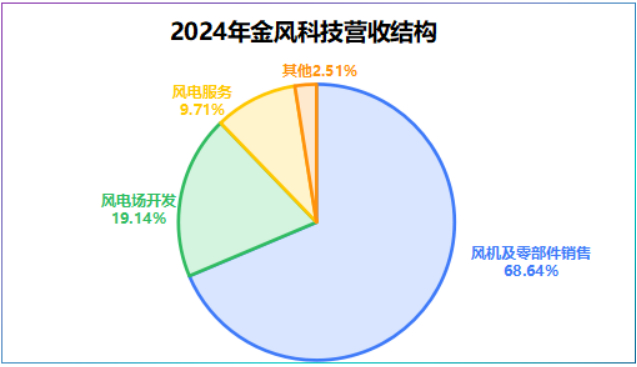 从产品结构上看,金风科技业务覆盖风机及零部件销售、风电场开发和风电服务三大块。其中,风机及零部件销售占公司2024年总营收的68.64%,是核心营收来源。