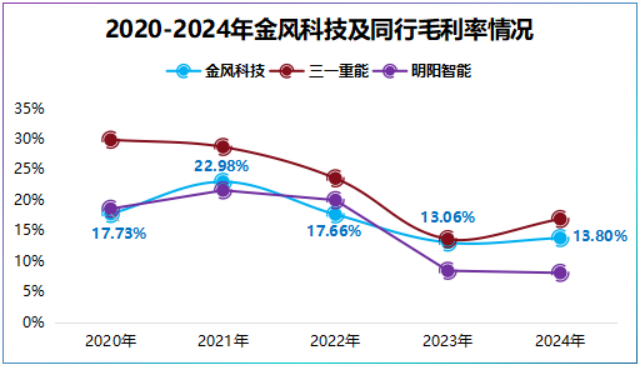 这种“营收大头利润薄,利润支柱占比小”的营收结构导致公司整体毛利率不高。数据显示,金风科技近五年毛利率在20%左右,甚至已经从2021年的22.98%下滑到了2024年的13.8%,显然打不过长江电力。