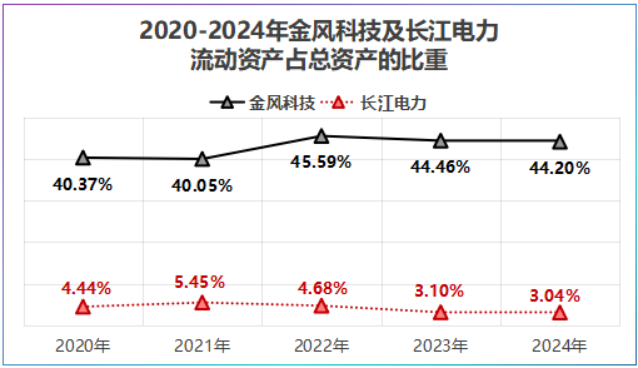 财报显示,2024年金风科技货币资金为116.2亿元,高出长江电力快50亿元,如果再加上交易性金融资产中的结构性存款,近三年金风科技账上的资金能稳定在120亿元以上,占流动资产的比重在20%左右。
