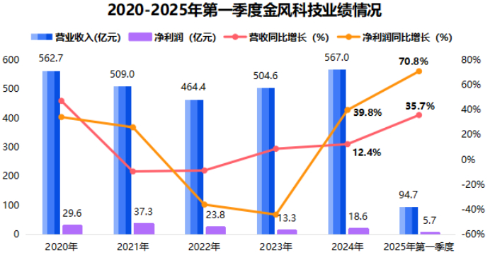 季度看,金风科技业绩表现更为亮眼。2025年第一季度,公司实现营收94.7亿元,同比增长35.7%,实现净利润5.68亿元,同比增长70.8%,环比大增731.6%。