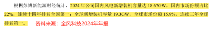 2024年,公司国内风电新增装机容量为18.67GW,市占率为22%,连续十四年全国第一,公司全球新增装机容量19.3GW,市占率为15.9%,连续三年全球第一。