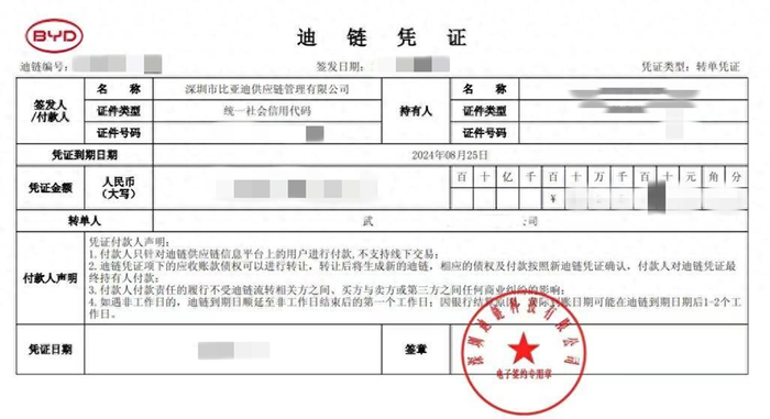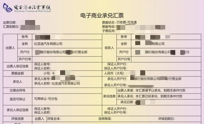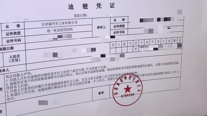 所以,比亚迪跟某供应商签订合同,双方规定好,要采购多少东西,供应商何时交货,然后比亚迪多久支付账款,而迪链则是更进一步,比亚迪向某供应商订购配件,供应商交付后,比亚迪不是给钱,而是向供应商出示一个商票,也就是商业承兑汇票,上有面额和承兑日期,即凭票在承兑日期及之后,可以向比亚迪拿到钱。