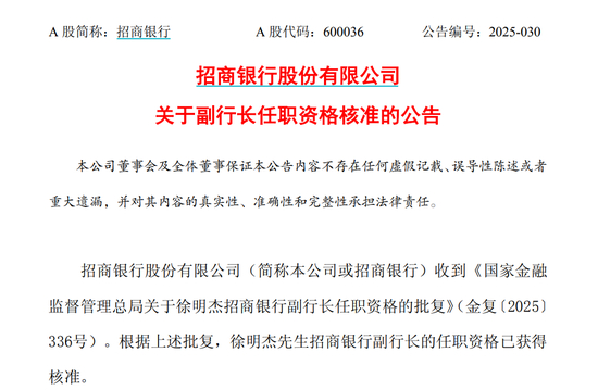 6月6日,招商银行公告称,收到《国家金融监督管理总局关于徐明杰招商银行副行长任职资格的批复》。根据上述批复,徐明杰招商银行副行长的任职资格已获得核准。徐明杰担任招商银行副行长的任期自核准日2025年6月4日起生效,至公司第十二届董事会届满之日止。