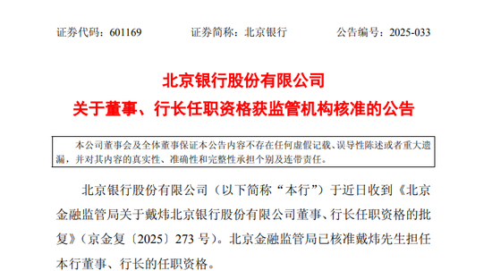 5月30日,北京银行发布公告称收到《北京金融监管局关于戴炜北京银行股份有限公司董事、行长任职资格的批复》,北京金融监管局已核准戴炜先生担任该行董事、行长的任职资格。
