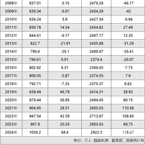 国家统计局数据显示,2024年,全国普通高中招生1036.2万人,首次突破1000万人,比上年增加68.4万人,是上年增幅的三倍多,且增幅为20年来之最;在校生2922.3万人,比上年增加118.7万人,按照这个增速,到2025年末高中在校生有望突破3000万人。