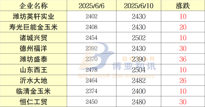 河南启动小麦最低收购价执行预案,利多玉米市场,持粮贸易商挺价惜售,支撑玉米价格强势上涨。6月9日,山东深加工企业收购价格再涨10-20元/吨,西王淀粉上调10元至2504元/吨,英轩实业、寿光金玉米、沂水大地上调10元,诸城兴贸上调18元,恒仁工贸上调14元;企业收购区间上移至2390-2504元/吨。