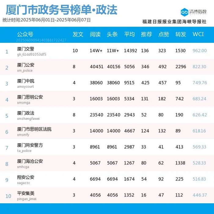 本期厦门市政务号榜单•政法,头部账号稳定发挥。“厦门交警”“厦门公安”蝉联榜一和榜二;“厦门中院”上升一位,跃居第三名;“厦门思明公安”大步流星,跃居第四名;“厦门政法”稳守第五名;“厦门市思明区法院”位居第六名;“厦门同安警方”前进一位,位居第七名;“厦门海沧公安”位居第八名;“翔安公安”位居第九名;“平安集美”重回榜单。