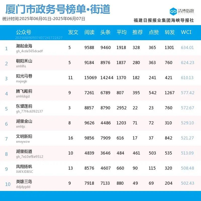 本期厦门市政务号榜单•街道,排名竞争较为激烈。“潮起金海”勇夺榜首;“朝阳禾山”前进两位,位居第二名;“阳光马巷”守住阵地,位居第三名;“腾飞殿前”前进两位,位居第四名;“东望莲前”“湖里金山”携手登榜;“文明新阳”位居第七名;“湖里街道”暂居第八名;“凤翔扬帆”前进一位,位居第九名;“英雄三岛”位居第十名。