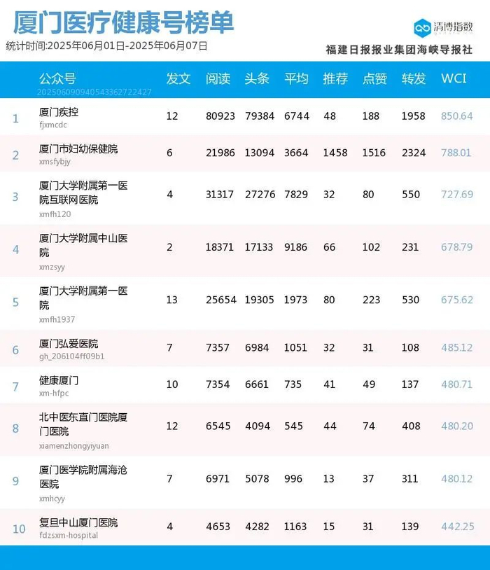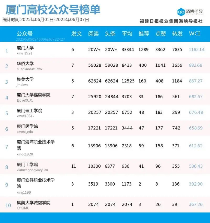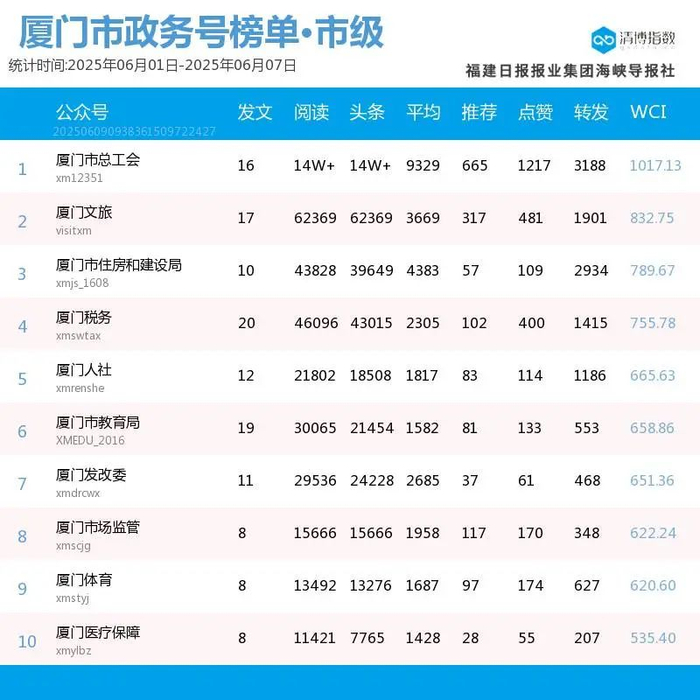 各领域“佼佼者”花落谁家?厦门微信公众号影响力排行榜2025年第23期来了