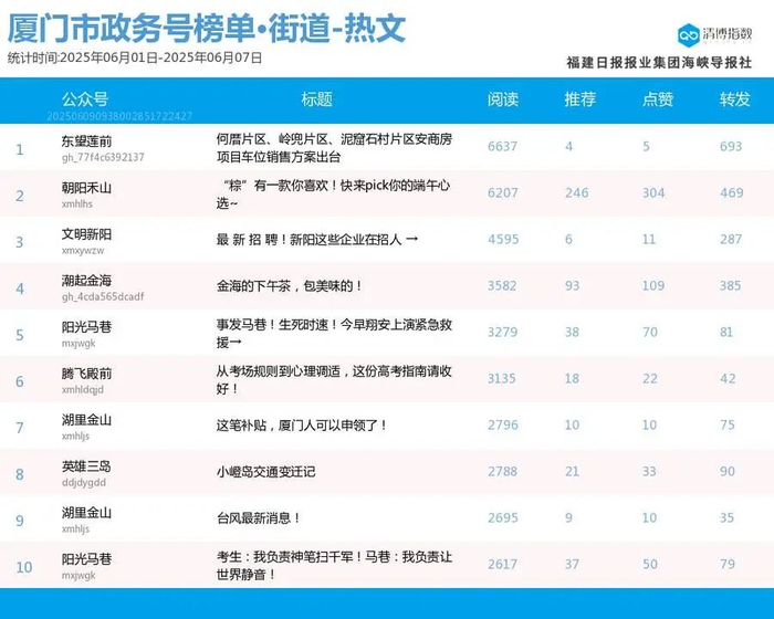 热文方面,“东望莲前”的《何厝片区、岭兜片区、泥窟石村片区安商房项目车位销售方案出台》一文拔得头筹。“朝阳禾山”的《“粽”有一款你喜欢!快来pick你的端午心选~》一文位居第二名。“文明新阳”的《最新招聘!新阳这些企业在招人→》一文位居第三名。“潮起金海”的《金海的下午茶,包美味的!》一文位居第四名。“阳光马巷”“湖里金山”有两篇推文入榜,表现不错。“腾飞殿前”“英雄三岛”各有推文入榜。