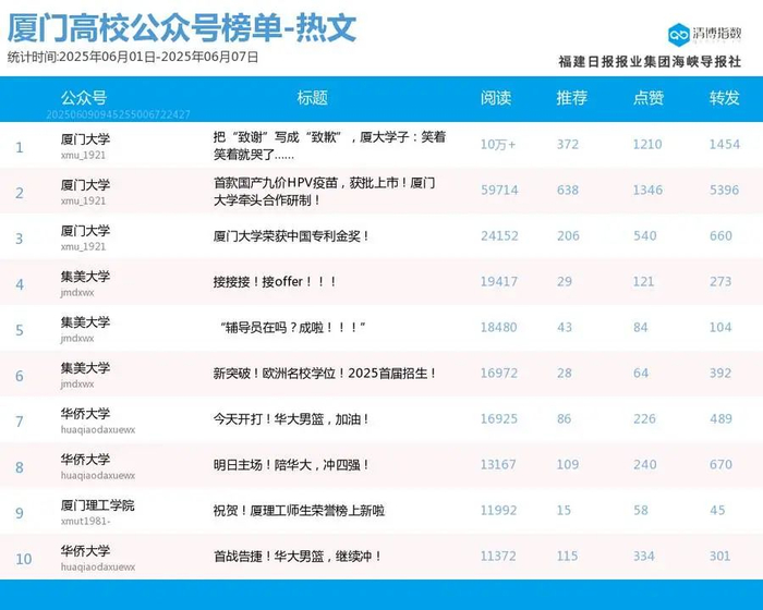 热文方面,“厦门大学”有三篇推文入榜,包揽了前三名,其中《把“致谢”写成“致歉”,厦大学子:笑着笑着就哭了……》一文位居榜首,《首款国产九价HPV疫苗,获批上市!厦门大学牵头合作研制!》一文收获本期最高的转发数。“集美大学”和“华侨大学”亦有三篇推文入榜。“厦门理工学院”的《祝贺!厦理工师生荣誉榜上新啦》一文位居第九名。