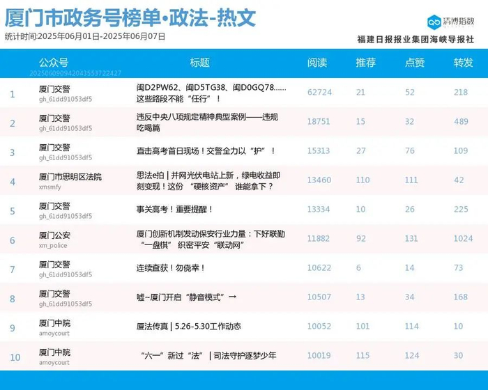 热文方面,“厦门交警”风采依旧,有六篇推文入榜,且包揽了前三名。“厦门市思明区法院”的《思法e拍 | 并网光伏电站上新,绿电收益即刻变现!这份 “硬核资产” 谁能拿下?》一文位居第四名。“厦门公安”的《厦门创新机制发动保安行业力量:下好联勤“一盘棋” 织密平安“联动网”》一文位居第六名。“厦门中院”有两篇推文入榜。