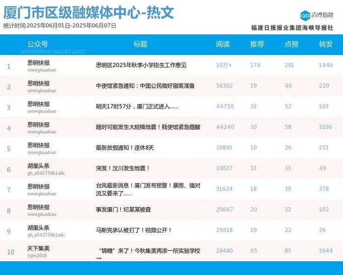 热文方面,“思明快报”表现优秀,有七篇推文入榜,涉及秋季小学招生、中使馆通知、节气、放假通知等内容,都取得不错的阅读。“湖里头条”有两篇推文入榜,分别位居第六名和第九名。“天下集美”的《“锦鲤”来了!今秋集美再添一所实验学校→》一文位居第十名。