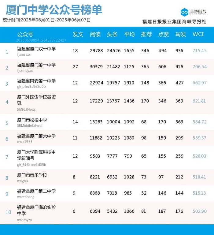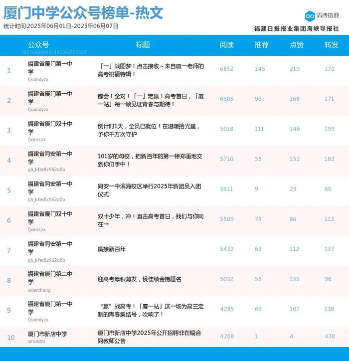 热文方面,本期正值高考,各家公众号献上对高考生的祝福。“福建省厦门第一中学”的《「一」战圆梦!点击接收~来自厦一老师的高考祝福特辑!》和《都会!全对!「一」定赢!高考首日,「厦一站」每一帧见证青春与期待!》位居榜一和榜二。“福建省厦门双十中学”的《倒计时1天,全员已就位!在温暖拾光里,予你千万次守护》和《双十少年,冲!直击高考首日,我们与你同在→》带来了满满的感动。“福建省同安第一中学”的《101岁的母校,把新百年的第一棒郑重地交到你们手中!》用不一样的方式表达了自己的祝福。“福建省厦门第二中学”的《迎高考厚积薄发,候佳绩金榜题名》一文位居第八名。