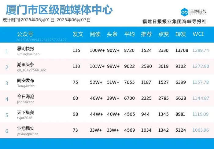 本期厦门市区级融媒体中心,排名略有变化。“思明快报”前进一位,夺回榜首;“湖里头条”暂居第二名;“同安发布”前进一位,位居第三名;“今日海沧”位居第四名;“天下集美”“业翔民安”保持位次不变。