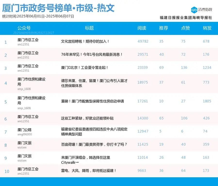 热文方面,“厦门市总工会”有五篇推文入榜,涉及招聘、台风信息、工会夏令营、岗位补贴、天气变化等,都取得不错的阅读。“厦门市住房和建设局”有两篇推文入榜,位居第四名和第五名。新面孔“厦门公路”的《福建省纪委监委通报四起违反中央八项规定精神典型问题》一文位居第七名。“厦门文旅”的《百亩荷塘!厦门最美赏荷季,你打卡了吗?》一文位居第八名。