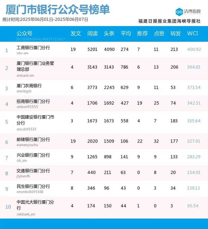 本期各家银行公众号,排名变化较大。“工商银行厦门分行”前进一位,夺得榜首;“厦门银行厦门业务管理总部”跃居第二名;“厦门农商银行”守住第三名;“招商银行厦门分行”前进两位,位居第四名;“中国建设银行厦门市分行”前进至第五名;“邮储银行厦门分行”跃居第六名;“兴业银行厦门分行”暂居第七名;“交通银行厦门分行”位居第八名;“民生银行厦门分行”“中国光大银行厦门分行”携手登榜。