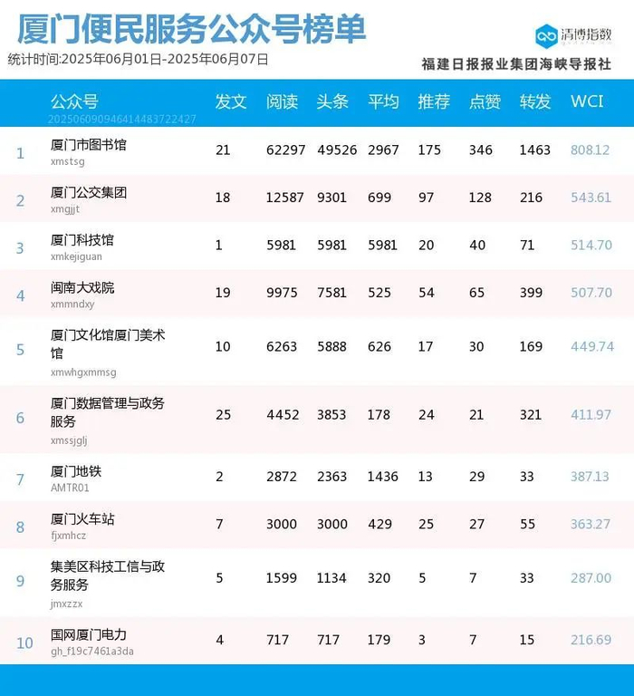 本期厦门便民服务公众号榜单,头部账号排名略有变化。“厦门市图书馆”蝉联榜首;“厦门公交集团”前进多位,位居第二名;“厦门科技馆”进步明显,跃居第三名;“闽南大戏院”位居第四名;“厦门文化馆厦门美术馆”向上提升两位,跃居第五名;“厦门数据管理与政务服务”重回榜单;“厦门地铁”位居第七名;“厦门火车站”前进两位,位居第八名;“集美区科技工信与政务服务”位居第九名;“国网厦门电力”位居第十名。