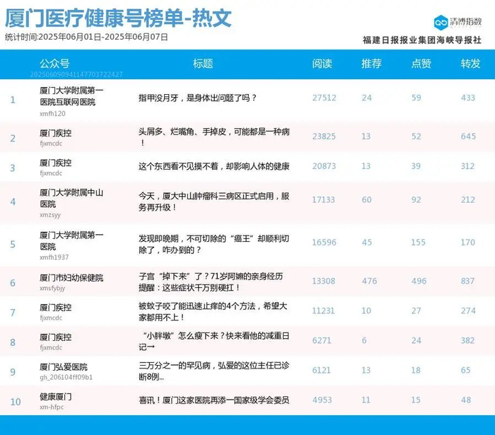 热文方面,“厦门大学附属第一医院互联网医院”的《指甲没月牙,是身体出问题了吗?》一文位居榜首。“厦门疾控”有四篇推文入榜。“厦门大学附属中山医院”的《今天,厦大中山肿瘤科三病区正式启用,服务再升级!》一文位居第四名。“厦门大学附属第一医院”的《发现即晚期,不可切除的“癌王”却顺利切除了,咋办到的?》一文位居第五名。“厦门市妇幼保健院”“厦门弘爱医院”“健康厦门”各有推文入榜。