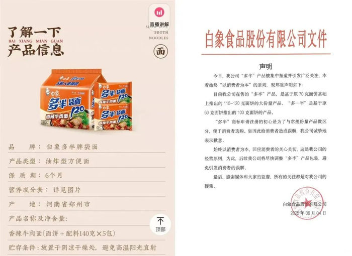 白象食品随即声明,申请注册“多半”商标,初心是与常规份量产品做区分,将尽快调整该产品包装。