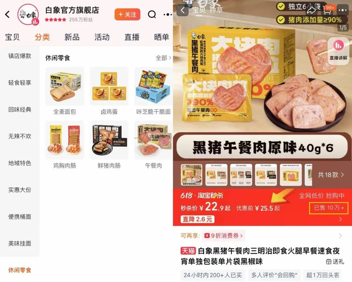 记者在天猫官方旗舰店看到,白象有荞麦面、油醋汁、魔芋凉皮等轻食,以及卤鸡蛋、鲜猪肉肠、全麦面包的等休闲零食在售。其中,午餐肉产品显示已售10万+。