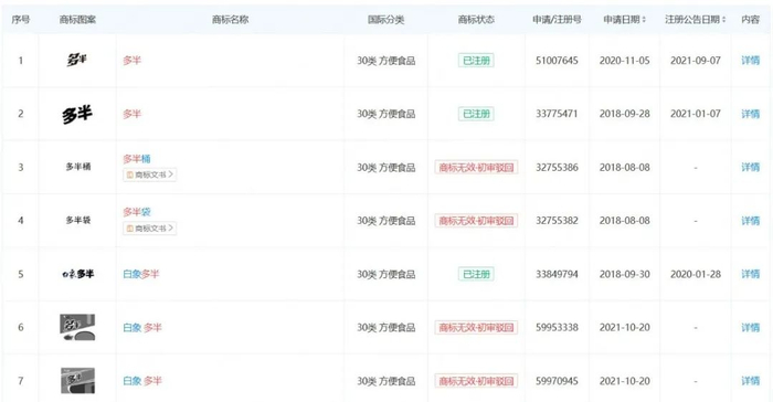 天眼查显示,“多半”“白象多半”“白象多半袋”以及“白象多半桶”等商标,大多在2018年至2021年间申请注册。