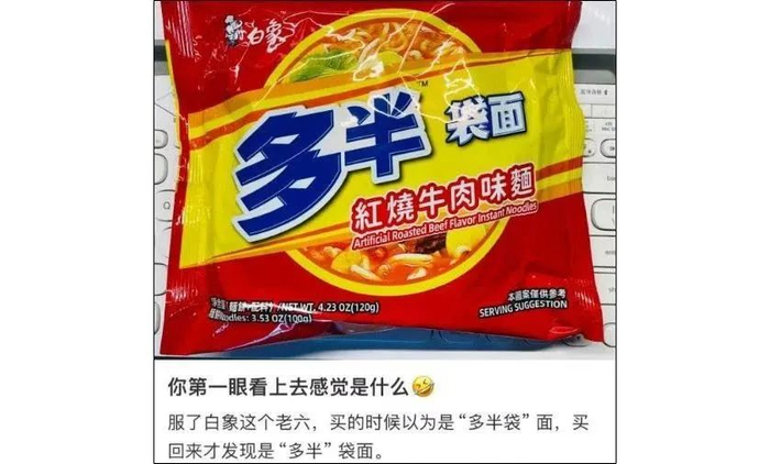 有消费者留意到,白象旗下的“多半袋面”和“多半桶面”系列产品,包装上以小字注释:“多半”是白象食品注册商标。