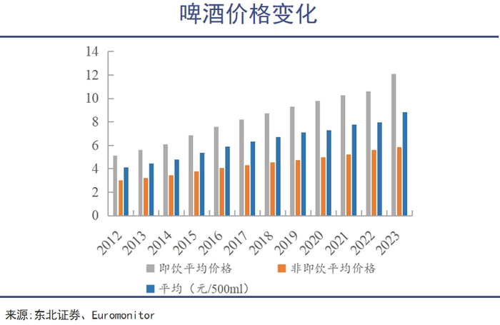 相比白酒,啤酒价格本身比较便宜,价格带差距更小。按零售价划分,低档啤酒价格小于6元,主流啤酒价格6-8元,次高档啤酒价格也不过8-10元。如果产品本身能在口感、配料、包装与品牌表达上匹配消费人群的心理预期,价格上的微幅提升并不会成为购买阻力。