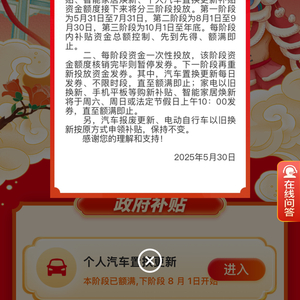 云闪付APP的相关公告还显示,佛山市从5月30日起对消费品以旧换新活动进行调整:一是家电以旧换新、手机平板等购新补贴、智能家居焕新、个人汽车置换更新补贴资金额度接下来将分三阶段投放。第一阶段为5月31日至7月31日,第二阶段为8月1日至9月30日,第三阶段为10月1日至年底。每阶段内补贴资金总额控制、先到先得、额满即止。