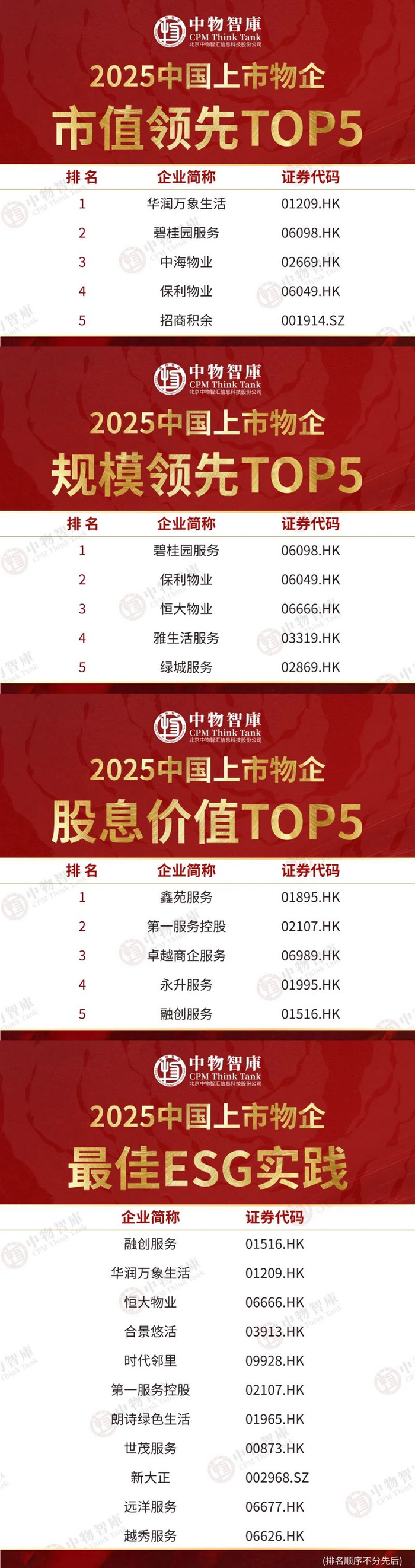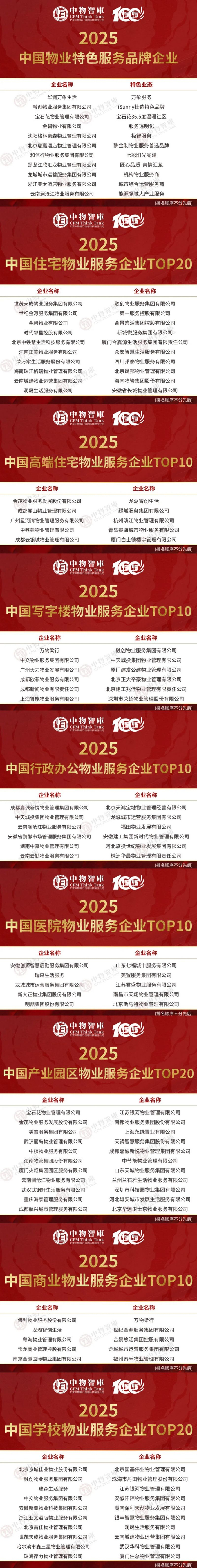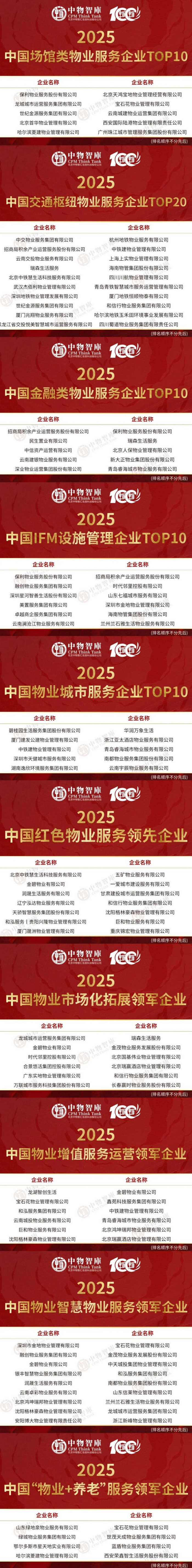2025年5月22日,由北京中物智汇信息科技股份公司(中物智库)主办的“好服务新价值”2025中物智库年度物业论坛在厦门隆重召开,会上重磅发布了《好服务新价值:2025中国物业服务企业综合实力研究报告》。同期隆重揭晓“2025中国物业服务综合实力百强企业”“2025中国物业国有企业百强”“2025中国物业品牌影响力百强企业”“2025中国物业管理行业上市物企20强”及系列细分业态、区域、标杆项目榜单,共同见证中国物业服务企业基业长青、业绩长虹!