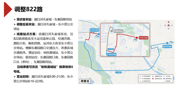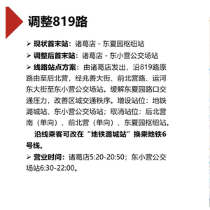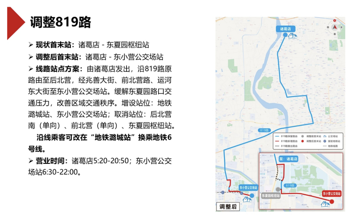 其中,拟调整819路,线路调整后,由诸葛店发出,沿819路原路线至后北营,经兆善大街、前北营路、运河东大街至东小营公交场站。增设站位:地铁潞城站、东小营公交场站;取消站位:后北营南(单向)、前北营(单向)、东夏园枢纽站。沿线乘客可改在“地铁潞城站”换乘地铁6号线。线路调整后,将缓解东夏园路口交通压力,改善区域交通秩序。
