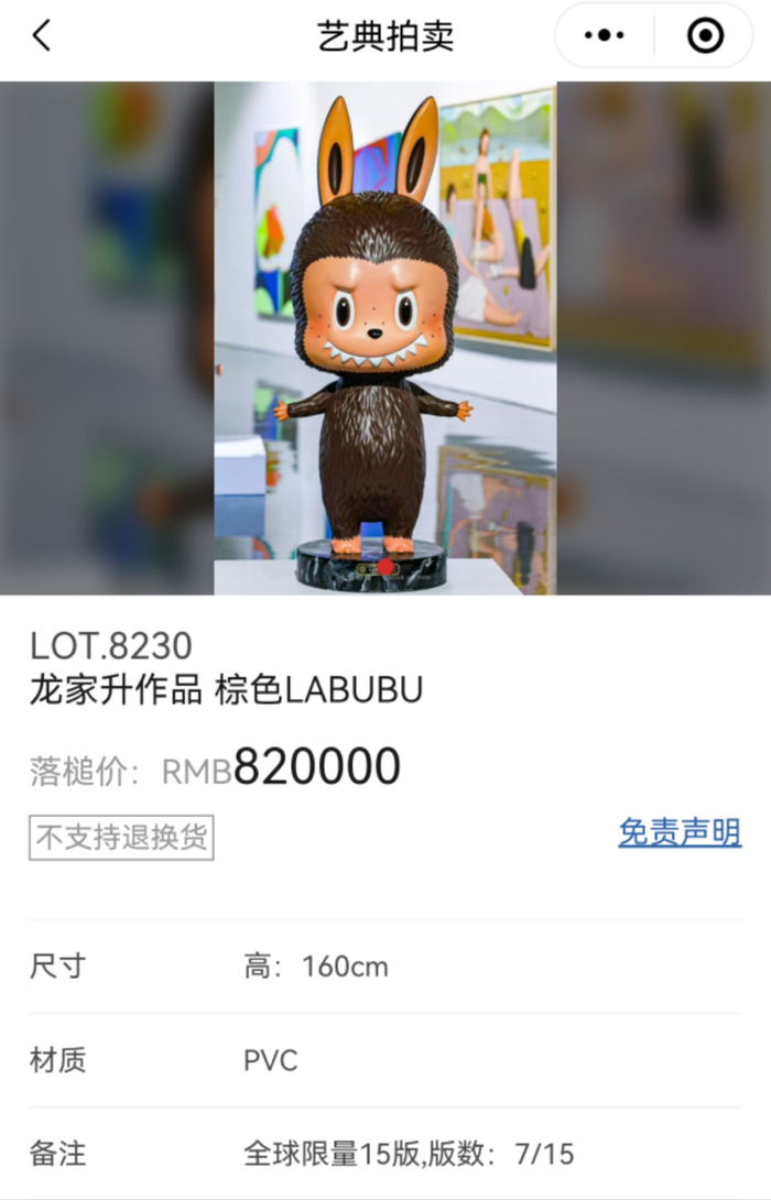 除此之外,一款全球限量15版棕色LABUBU以82万元成交。