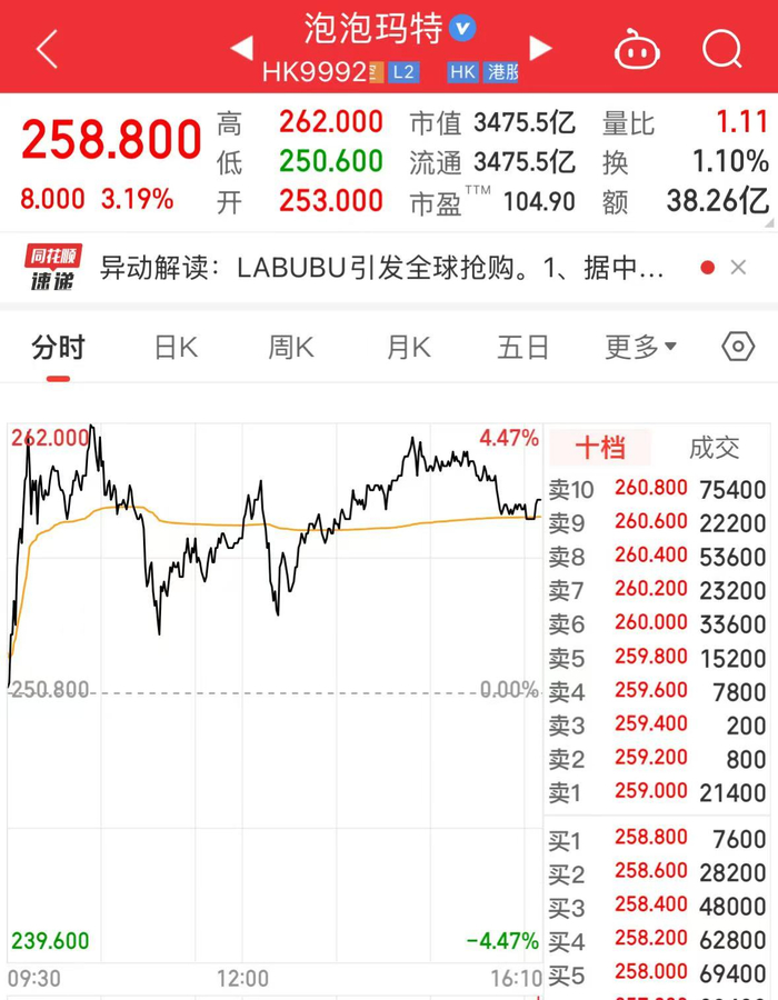 截至6月10日收盘,泡泡玛特股价报258.8港元/股,总市值3475.5亿港元。以2024年12月31日的收盘价计算,今年以来,泡泡玛特股价已上涨203.71%。