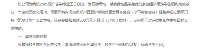 2022年6月,王宁还为郑州西亚斯学院捐赠500万元并设立了以公司名字命名的奖学金——泡泡玛特筑梦助学金。