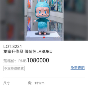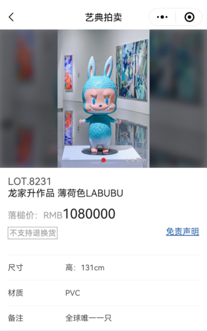 6月10日,在永乐2025春季拍卖会上,一款显示为初代藏品级薄荷色的LABUBU最终以108万元的价格完成竞拍。据了解,此次拍卖出现在全球首场初代藏品级LABUBU艺术专场。该款LABUBU尺寸为高131cm,材质为PVC,颜色为薄荷色,在备注栏标注了“全球唯一一只”。