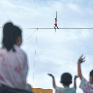 6月6日,演员在乌鲁木齐杉杉奥特莱斯购物广场表演高空达瓦孜。天山网-新疆日报记者邹懿 摄