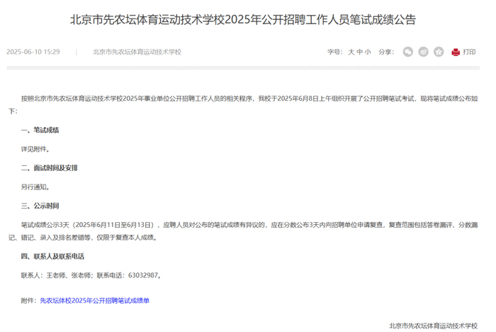 6月10日,北京市体育局网站发布《北京市先农坛体育运动技术学校2025年公开招聘工作人员笔试成绩公告》,此前网友热议的乒乓球队教练员岗位应聘者王皓已通过笔试,进入“实操阶段”。
