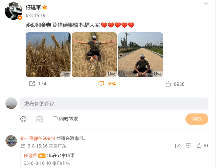 近日,演员任达华在山东拍戏期间回到老家山东省济宁市,恰逢小麦成熟收割期,任达华特意体验农活,并发微博晒出自己的麦田打卡照片。