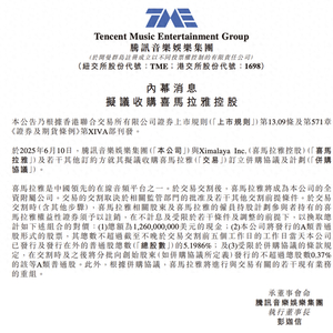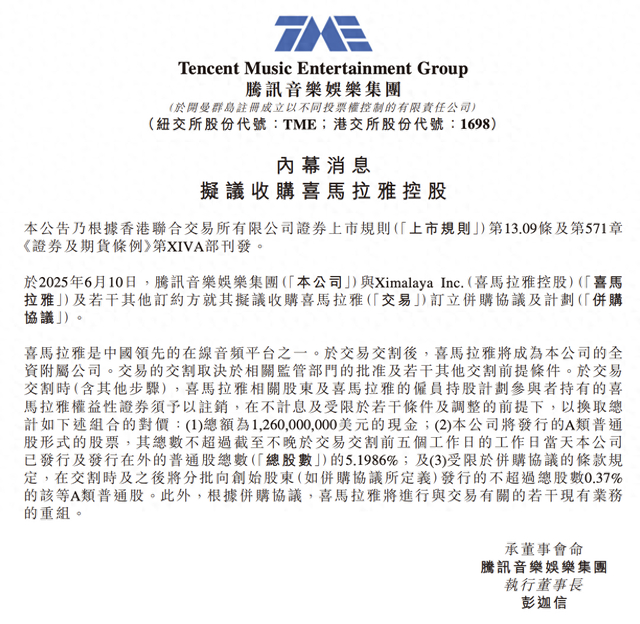6月10日晚,腾讯音乐娱乐集团(TME)发布公告称,与喜马拉雅签署并购协议,计划以现金12.6亿美元及约5.2%的腾讯音乐股权组合,全资收购喜马拉雅。