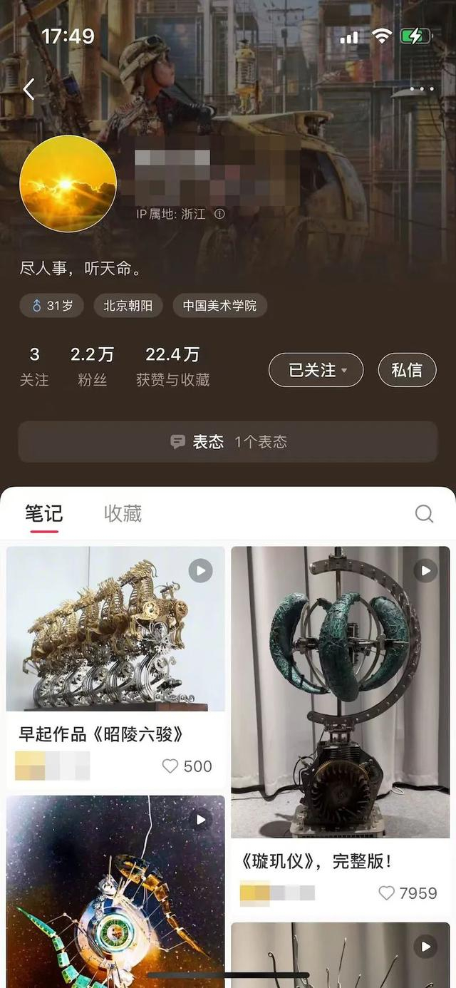 值得一提的是,记者发现,国美爆火作品作者聂士昌的小红书账号处发现,其个人账号发布的第一条帖子即是毕业作品《滴动仪》,发布于6月4日。之后,发布的帖子是《循回仪》《律动》《枯木逢春》等作品。在此之前,该账号没有相关作品、生活经历等分享。自他开始在发帖至今的一周内,已获得2.3万粉丝,其作品的获赞与收藏则达到了22.4万。