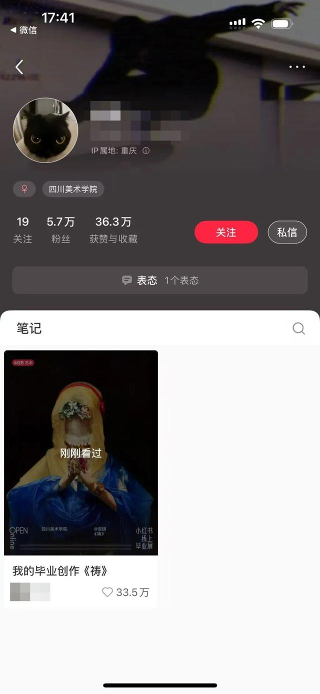 同样,四川美院的人气作品《祷》或许亦是如此。记者试图想通过社交平台更多了解作者安琪的生活,但她的小红书账号内只有这一幅作品的帖子。然而,在这张作品发布三天后,其粉丝已跃升至近6万,作品的点赞数量已超过36万。