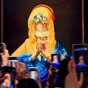 无独有偶,在四川美术学院的毕业展上,油画系2025届毕业生安琪的作品《祷》也在社交平台上爆火异常——红黄蓝三原色被分配给了戴在了一个木头“模特”头上的耳机、纱巾和“模特”身上盖着的纱巾。“模特”的脸则由大家网购时经常见到的气泡膜所覆盖,看不到容貌。有网友戏称其为 “重庆人自己的《蒙娜丽莎》” ,这一标签也迅速在社交平台传播开来。